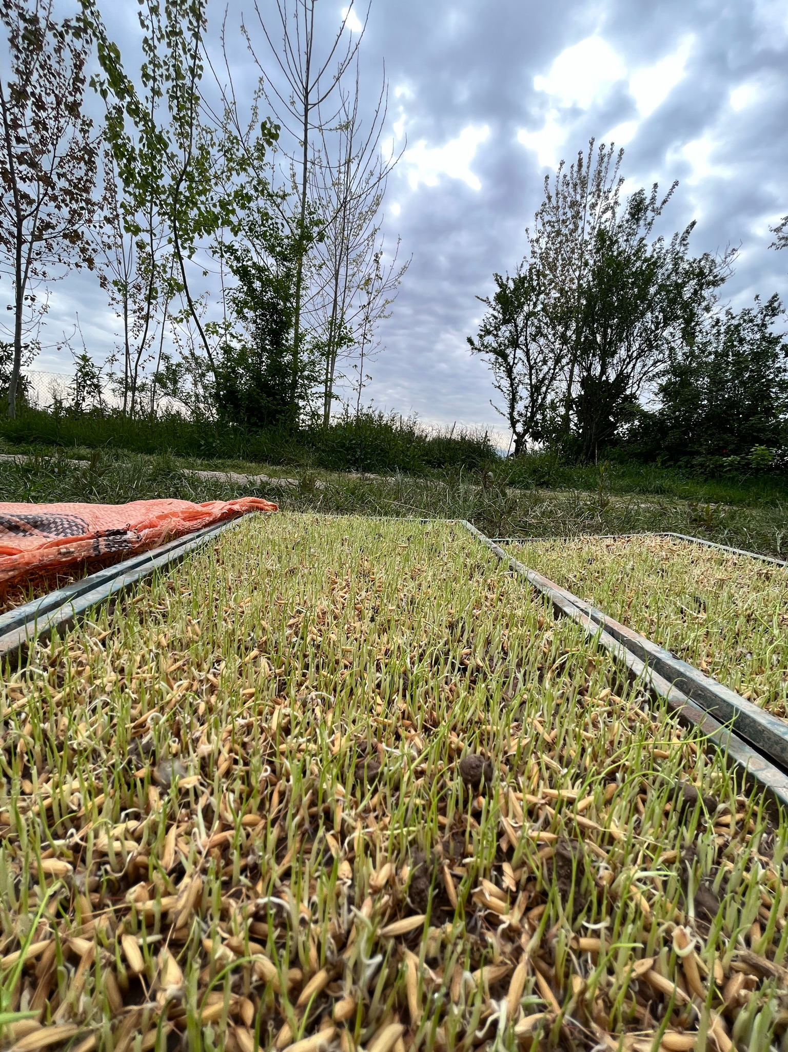 آغاز بهار با خیساندن جو (دانهی برنج) همزمان است، درست مثل سبزه سبز کردن برای هفت سین. وقتی جو کمی جوانه زد، زن گیلانی سینیهای فلزی را پر از دانه برنج میکند و در زمان مناسب سینیها را به خزانهی برنج میبرد.